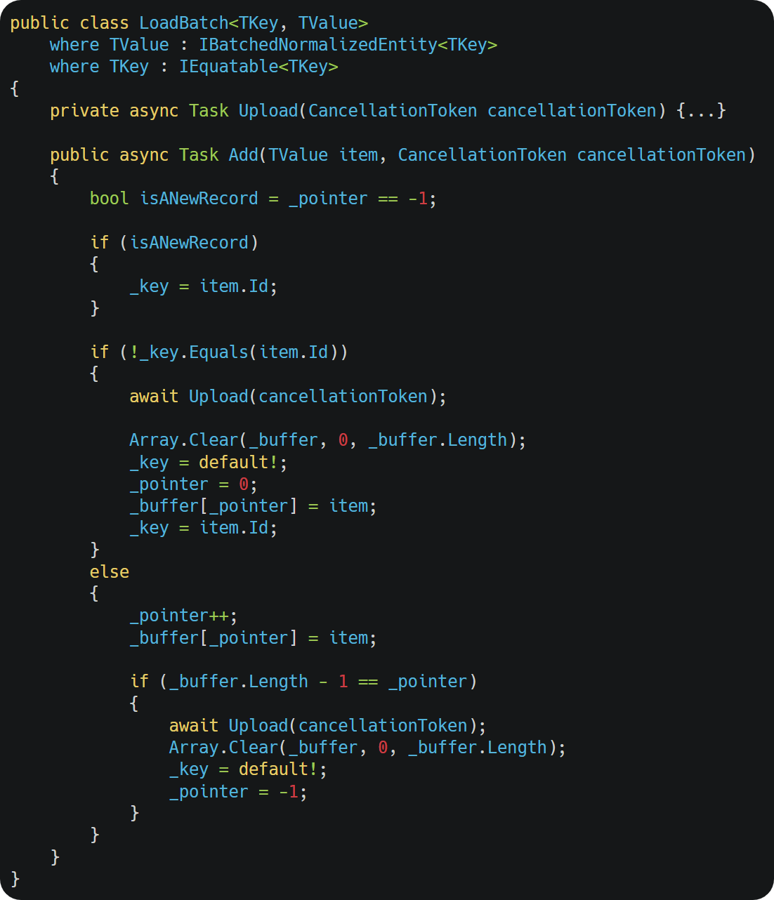 Initialization: CustomBatchBock is set up to group incoming data into batches based on Batch and ID, with a specified batch size.