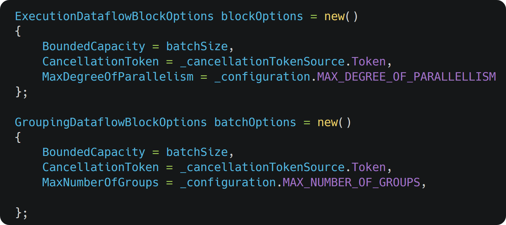 Blocks can be configured to adapt to specific requirements. In this particular instance, the process involves specifying various parameters. Specifically, we provide information on the capacity, cancellation token, and maximum degree of parallelism for both the Transformation and Action Blocks. Additionally, for the Batch blocks, the configuration encompasses setting the maximum number of groups, this configuration approach ensures that each block operates in alignment with the desired parameters, enhancing the adaptability and efficiency of the overall Dataflow system.