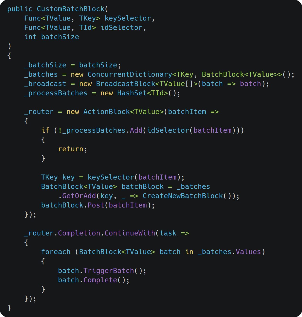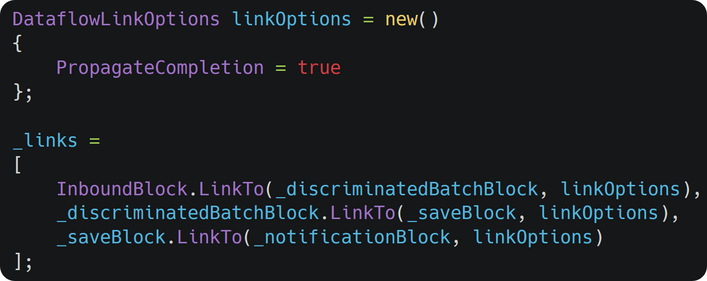 Block Setup: It uses a dictionary to discriminate batches by key, an action block to process and route data, and a broadcast block to share multiple batches.