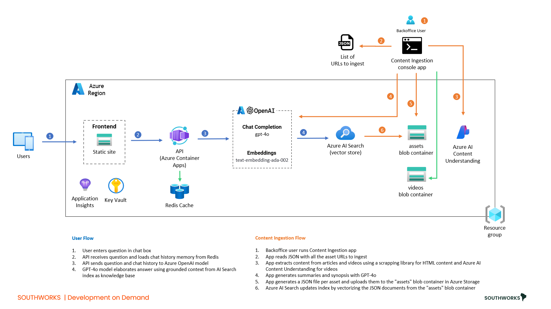 The user query flow is implemented with a traditional RAG pattern. When a user submits a message through the chat interface (hosted on a static site), the API driven backend handles the request. It first fetches recent chat history from Azure Cache for Redis (acting as a memory store) to maintain conversation context. The query is then sent to Azure OpenAI Service, where GPT-4o processes the input and generates a relevant, natural-sounding response.
