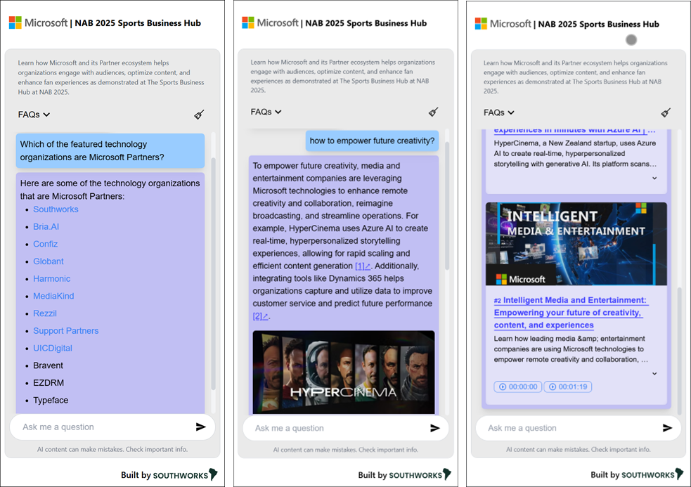 By harnessing Azure AI Foundry and Azure AI services, SOUTHWORKS seamlessly implemented a chatbot experience grounded with relevant data about Microsoft and their sports activation at the NAB Show 2025 Sports Business Hub.